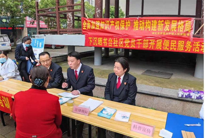 4月25日,孝感中院民三庭赴孝感市孝南區曬書臺社區開展了主題為“全面加強知識產權保護 推動構建新發展格局”的知識產權宣傳活動,提高人民群眾對于知識產權的重視程度,營造良好的創新文化氛圍。活動現場設立了法律咨詢宣傳點,懸掛了知識產權宣傳標語,通過發放知識產權宣傳折頁、現場普及講解知識產權相關知識、典型案例等方式,引導人民群眾認識了解全國知識產權宣傳周活動,理解知識產權保護范圍及相關法律制度。