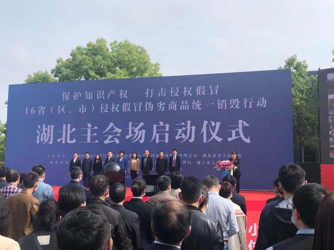 4月23日,“保護知識產權,打擊侵權假冒” 16省(區、市)侵權假冒偽劣商品統一銷毀行動湖北主會場啟動儀式在咸寧舉行。