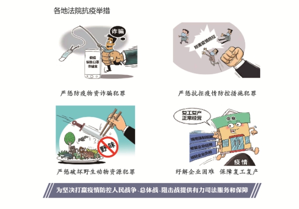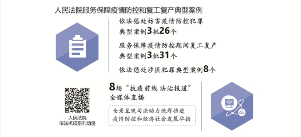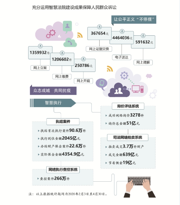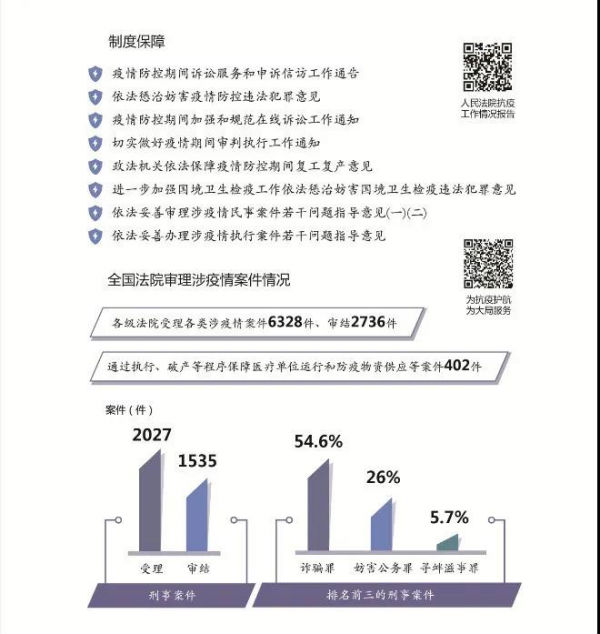 面對突如其來的疫情,最高人民法院堅決貫徹習近平總書記重要指示精神和黨中央決策部署,在中央政法委領導下,認真落實依法防控要求,單獨或會同有關單位制定依法懲治妨害疫情防控犯罪、懲治妨害國境衛生檢疫犯罪、保障復工復產等意見,完善服務“六穩”“六保”司法舉措,發布57個懲處涉疫犯罪和服務復工復產典型案例,努力為抗疫護航、為大局服務。各級法院統籌做好疫情防控和維護穩定等工作,審結各類涉疫案件2736件,促進涉疫矛盾糾紛源頭預防化解;嚴懲侵害醫務工作者人身安全和人格尊嚴犯罪,保護抗疫中負重前行的“最美逆行者”;堅持審慎善意文明司法,積極為中小微企業紓困解難;運用遠程立案、網上審判、智慧執行及時定分止爭。智慧法院在疫情防控期間“大顯身手”,全國法院網上立案136萬件、開庭25萬次、調解59萬次,電子送達446萬次,網絡查控266萬件,司法網拍成交額639億元,執行到位金額2045億元。廣大法院干警特別是湖北和武漢法院干警堅決響應黨中央號召,積極投身各地抗疫一線,為統籌推進疫情防控和經濟社會發展工作提供了司法服務和保障,體現了忠于黨、忠于國家、忠于人民、忠于法律的政治本色。