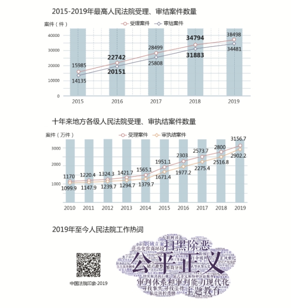 2019年,最高人民法院堅持以習近平新時代中國特色社會主義思想為指導,在以習近平同志為核心的黨中央堅強領導下,在全國人大及其常委會有力監督下,增強“四個意識”、堅定“四個自信”、做到“兩個維護”,全面貫徹黨的十九大和十九屆二中、三中、四中全會精神,深入貫徹習近平總書記主持中央政治局常委會會議聽取最高人民法院黨組工作匯報時的重要講話精神,認真落實十三屆全國人大二次會議決議,緊緊圍繞“努力讓人民群眾在每一個司法案件中感受到公平正義”目標,堅持服務大局、司法為民、公正司法,忠實履行憲法法律賦予的職責,推動各項工作取得新成效,為經濟社會發展提供有力司法服務和保障。最高人民法院受理案件38498件,審結34481件,同比分別上升10.7%和8.2%,制定司法解釋20件,發布指導性案例33個,加強對全國法院審判工作的監督指導;地方各級法院受理案件3156.7萬件,審結、執結2902.2萬件,結案標的額6.6萬億元,同比分別上升12.7%、15.3%和20.3%。