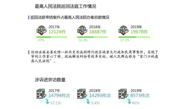 司法改革和智慧法院作為人民法院審判體系和審判能力現代化的“車之兩輪、鳥之雙翼”,有力提升了審判質效。2019年,全國法院法官人均辦案228件,同比增長13.4%;各類案件一審后當事人服判息訴率89.2%,二審后達到98.2%;涉訴信訪總量、涉訴進京訪同比分別下降13.3%和40%;互聯網法院案件平均審理周期42天,比傳統模式縮短57.1%。