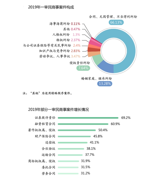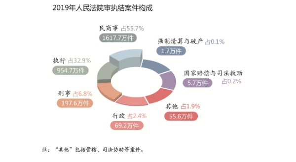 1.審結、執結2902.2萬件:指地方各級人民法院2019年審結、執結各類案件總數。其中,審結刑事案件1975511件,占6.81%;民商事案件16177373件,占55.74%;行政案件692034件,占2.38%;國家賠償與司法救助案件57377件,占0.20%;執結執行案件9546952件,占32.90%;強制清算與破產案件17399件,占0.06%;其他案件555710件,占1.91%。報告中的案件數據,未經特別說明的,均為一審結案數據。報告中反映的各項工作,包括最高人民法院和地方各級人民法院工作。