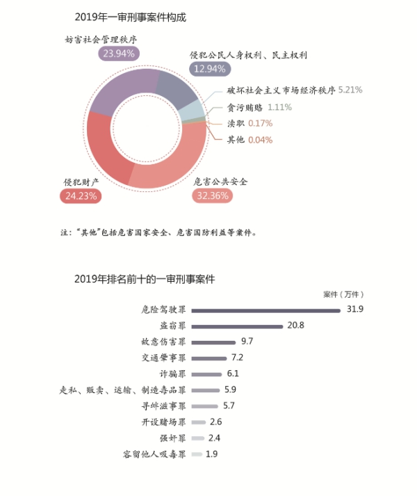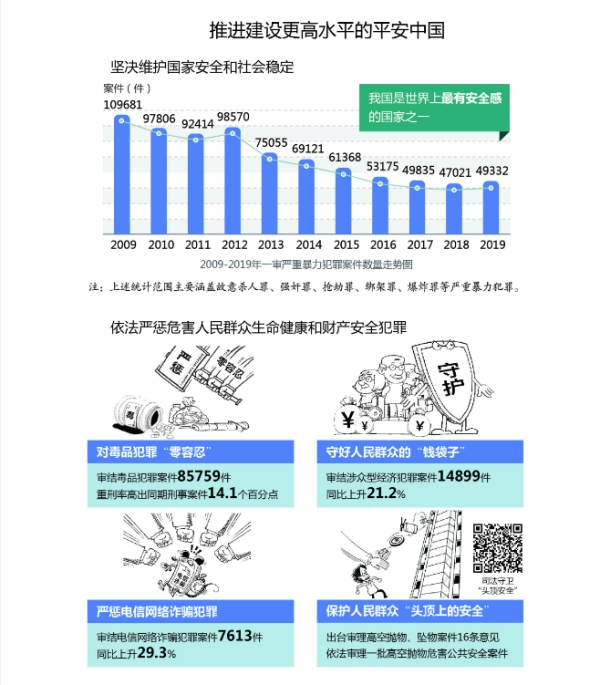 堅決維護國家安全和社會穩定。審結一審刑事案件129.7萬件,判處罪犯166萬人。依法嚴懲各種滲透顛覆破壞、暴力恐怖、民族分裂、宗教極端等犯罪,堅定捍衛國家政治安全和人民根本利益。始終保持對嚴重危害社會治安犯罪高壓態勢,審結嚴重暴力犯罪案件4.9萬件,多發性侵財犯罪案件27.2萬件,涉槍涉爆、涉賭涉黃犯罪案件6.5萬件,嚴重暴力犯罪案件連續十年呈下降態勢,社會治安保持平穩有序。深入開展禁毒斗爭,審結毒品犯罪案件8.6萬件。會同應急管理部等強化行政執法與刑事司法銜接,依法懲治安全生產違法犯罪,保障人民群眾生命財產安全。會同最高人民檢察院、公安部發布懲治襲警違法犯罪意見,切實維護人民警察人身安全和執法權威。依法審理劫持公交車撞人、校園門口砍殺無辜、殺害順風車乘客等一批重大惡性案件,對罪行極其嚴重的犯罪分子依法判處死刑,充分發揮刑罰震懾作用。