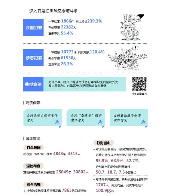 深入開展掃黑除惡專項斗爭。堅決貫徹依法嚴懲方針,全國法院審結涉黑涉惡犯罪案件12639件83912人。依法審理孫小果案、杜少平操場埋尸案,對主犯孫小果、杜少平堅決判處并執行死刑,讓正義最終得以實現。會同有關單位出臺辦理惡勢力、“套路貸”、非法放貸等刑事案件意見,明確政策法律界限,確保打得狠、打得準。堅決“打傘破網”,嚴懲公職人員涉黑涉惡犯罪。實行“打財斷血”,綜合運用判處財產刑、追繳、沒收違法所得等手段,徹底鏟除黑惡勢力經濟基礎。專項斗爭開展以來,依法懲處了一批作惡多端的“沙霸”“路霸”“菜霸”,凈化了社會風氣。