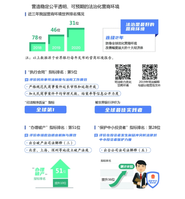 營造法治化營商環境。法治是最好的營商環境。各級法院審結一審商事案件453.7萬件。制定服務高質量發展意見,出臺公司法、破產法司法解釋,發布民商事審判工作會議紀要,統一法律適用和裁判尺度,增強司法透明度和可預期性。依法審理涉“放管服”改革行政訴訟案件,支持監督行政機關依法行政,審結一審行政案件28.4萬件,助推法治政府建設,優化發展軟環境。世界銀行2020年營商環境報告顯示,我國營商環境世界排名大幅躍升,“執行合同”“辦理破產”“保護中小投資者”等與司法密切相關的指標明顯提高,其中“司法程序質量”領先,被評價為這一領域的“全球最佳實踐者”。