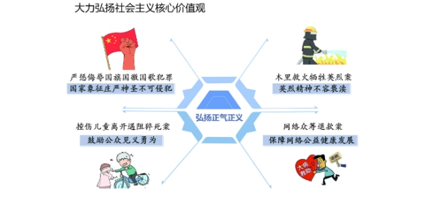 弘揚社會主義核心價值觀。高揚愛國主義旗幟,嚴懲侮辱國旗國徽國歌犯罪,宣示國家象征莊嚴神圣不可侵犯。審結英烈保護公益訴訟案件22件,對侵害方志敏、董存瑞、黃繼光、木里救火犧牲勇士等英烈權益的行為,嚴肅追究法律責任,旗幟鮮明捍衛英烈榮光。貫徹《新時代公民道德建設實施綱要》,堅持把社會主義核心價值觀融入司法工作,用法治力量引導人們向上向善。會同國家發展改革委等健全失信被執行人聯合懲戒機制,鼓勵誠實守信,懲戒失信違約。審理網絡眾籌退款等案件,規范網絡公益行為,守護扶危濟困、誠信友善的傳統美德。