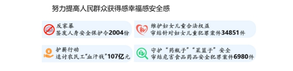 二是著力服務更高水平的平安中國建設。嚴厲打擊敵對勢力滲透、破壞、顛覆、分裂活動。依法懲治影響常態化疫情防控各類犯罪,堅決維護國家安全、生物安全、公共衛生安全和社會穩定。立足司法職能推動健全公共衛生體系,強化公共衛生法治保障。依法懲治職務犯罪,服務一體推進不敢腐、不能腐、不想腐。嚴懲公共安全、民生保障等領域犯罪,加強新型犯罪問題研究應對。強化人權司法保障,依法保障律師執業權利。深化掃黑除惡專項斗爭,依法公正高效審理涉黑涉惡犯罪案件,讓每一起案件都經得起法律和歷史檢驗,讓人民群眾收獲更多安全感。