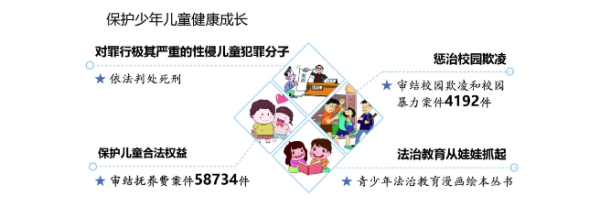 保護未成年人健康成長。完善少年司法制度,堅持圓桌式審判。廣州中院陳海儀法官用母親般的關懷幫助失足少年走向新生。通過組織觀摩少年法庭,讓少年體驗司法,學習法律常識。依法嚴懲侵害少年兒童身心健康的犯罪,對性侵兒童的趙志勇、何龍等罪行極其嚴重的一批犯罪分子,堅決依法判處死刑。會同民政部等出臺意見,加強對無人撫養兒童的保護,貴州等法院專門制定保護農村留守兒童合法權益文件,讓每一個孩子都沐浴在法治的陽光下。加強校園欺凌預防處置,審結相關案件4192件。會同教育部等完善校園安全事故處理機制,依法懲治涉及“校鬧”的犯罪。積極推進司法保護與行政、家庭、學校、社區保護聯動機制試點,用法治呵護少年兒童健康成長。