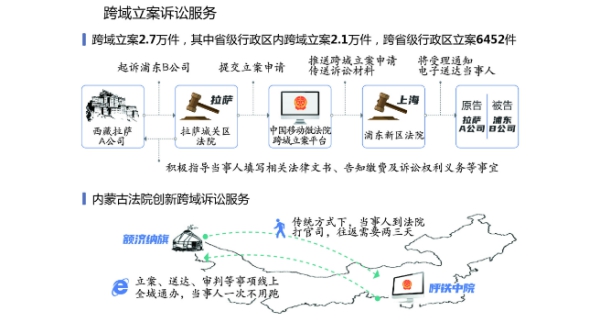 推廣跨域立案訴訟服務。在全國范圍全面推開跨域立案訴訟服務,當事人可以就近選擇法院提交立案申請,減少往來奔波。京津冀、長三角地區率先實現跨域立案域內全貫通,全國中級、基層法院和海事法院實現跨域立案服務全覆蓋,“家門口起訴”新模式有效解決群眾異地訴訟不便問題。
