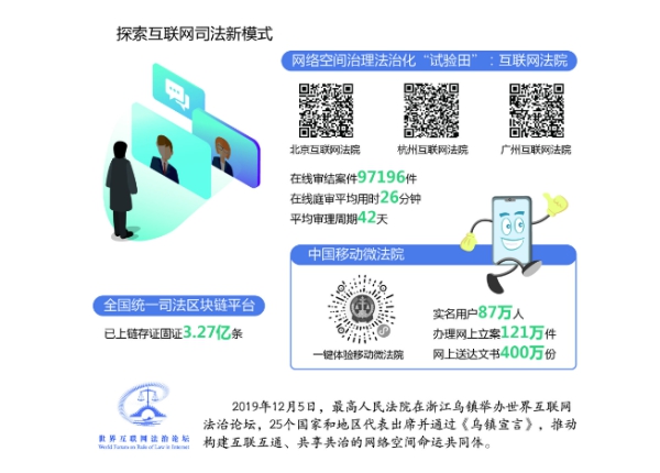 探索互聯網司法新模式。發揮北京、杭州、廣州互聯網法院“試驗田”作用,推廣“網上案件網上審理”,完善在線訴訟規則,讓群眾享受在線訴訟便利。全面推廣“中國移動微法院”,推動電子訴訟服務向移動端發展,引領世界移動電子訴訟發展潮流。審理“直播帶貨”“暗刷流量”等新型互聯網案件,明確網絡空間行為規范、權利邊界和責任,促進網絡空間治理法治化。在烏鎮舉辦世界互聯網法治論壇,深化互聯網司法國際合作,推動構建網絡空間命運共同體。