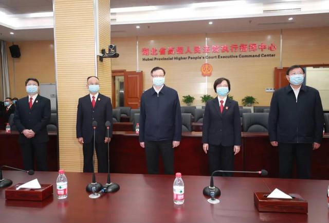 在走訪湖北高院時,應勇察看了湖北高院執行指揮中心,看望慰問了法官和司法干警代表。疫情期間,全省法院機關統籌推進疫情防控和依法辦案,確保工作不斷檔;同時推動機關干部下沉社區,助力基層抗疫。