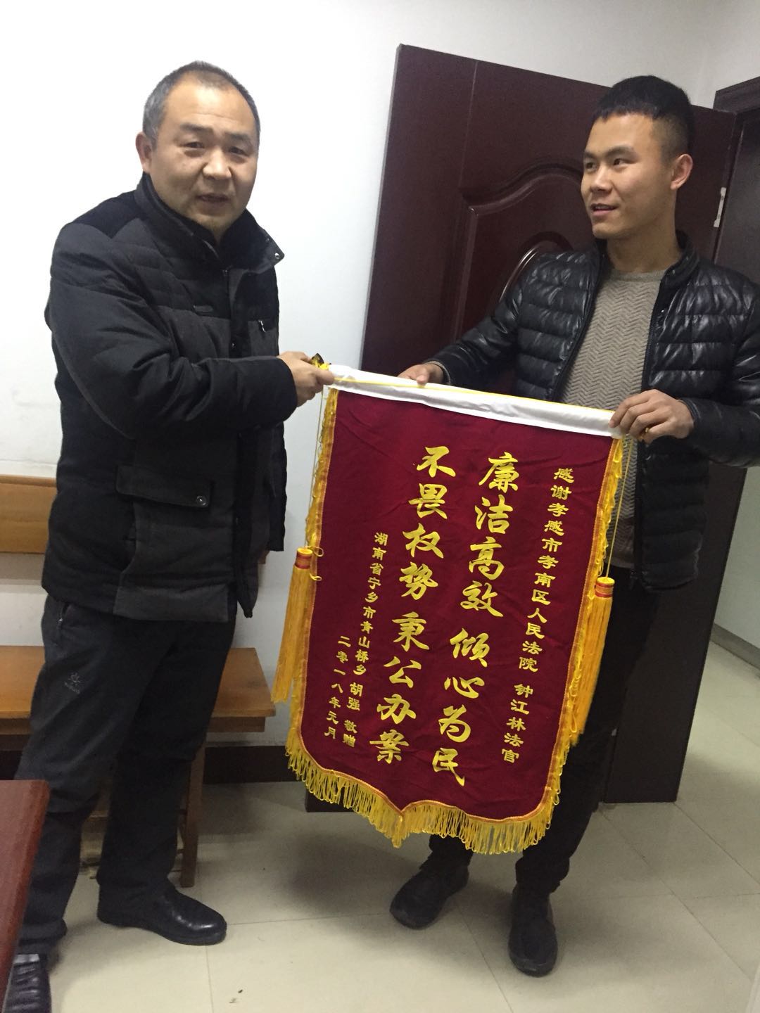 近日,當事人胡某拿著一面寫著“廉潔高效,傾心為民,不畏權勢,秉公辦案”的錦旗送到孝感市孝南區人民法院澴城法庭。當見到案件的主辦法官鐘江林時,感激之情溢于言表,一再激動地說:“感謝孝南區區法院,感謝鐘法官,在這件案子的處理過程中,讓我們體會到什么是公平正義。”